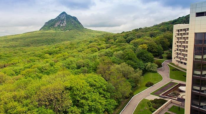 Санаторий «Горный воздух» расположен в уникальной ландшафтной зоне, среди естественного лесопарка, на склоне горы Железной. Новый лечебно-диагностический корпус санатория примыкает непосредственно к основному городскому терренкуру вокруг горы Железной и находится в нескольких сот метрах от городской питьевой галереи