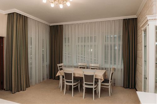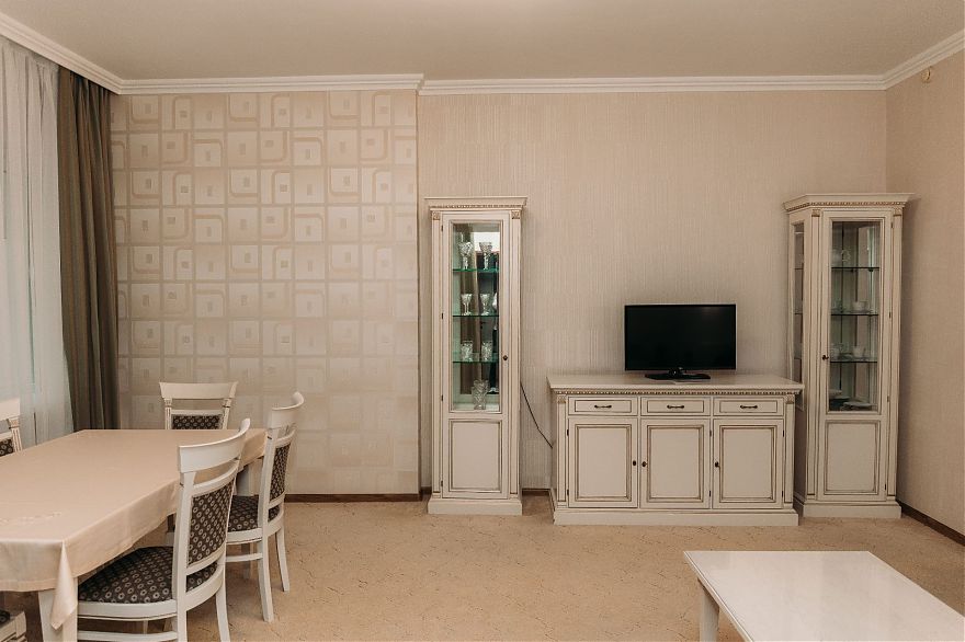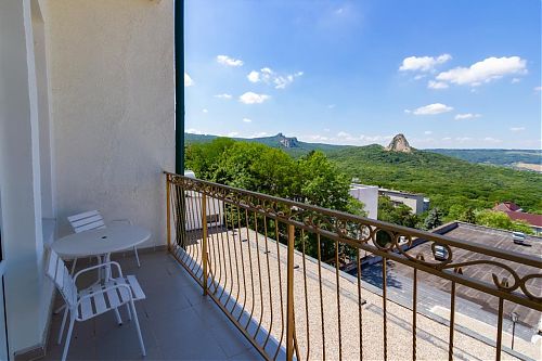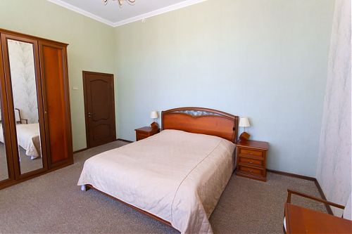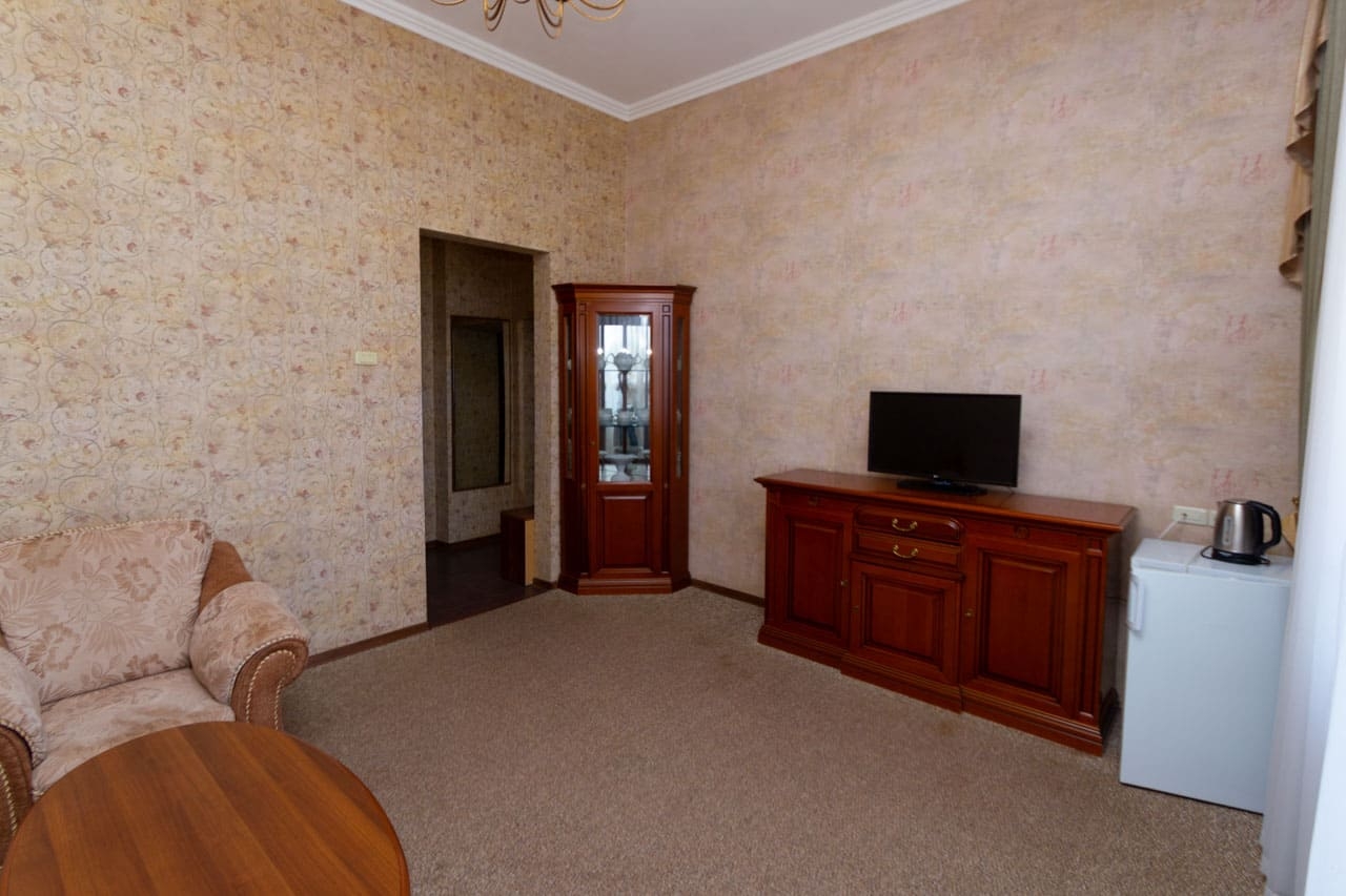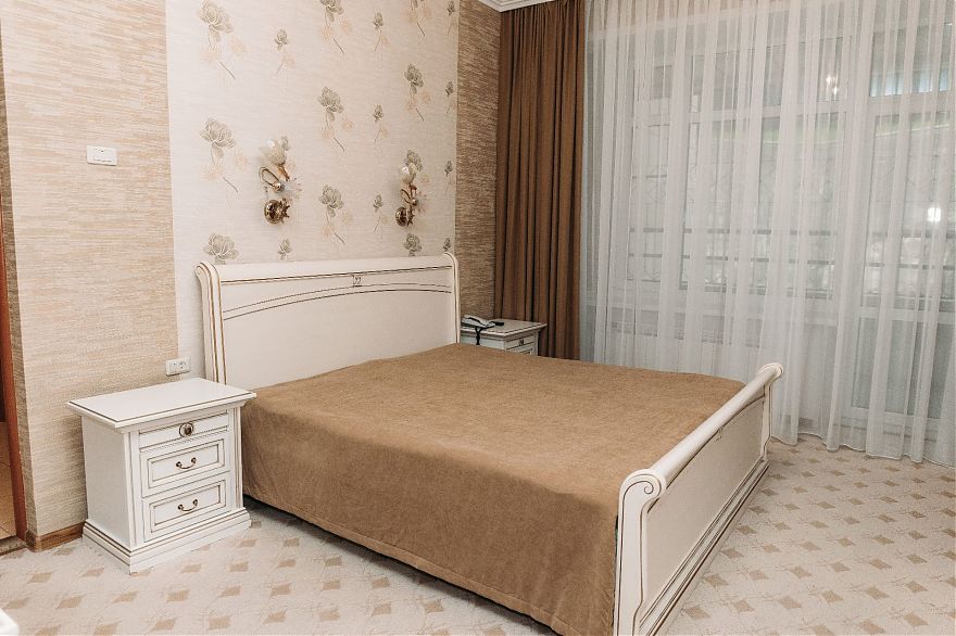 Двухкомнатный люкс в нашем санатории сочетает максимальный комфорт и приватность пространства. Главный зал с мягкой зоной отдыха приглашает расслабиться и погрузиться в атмосферу гармонии. Спальня обустроена большой и комфортной двуспальной кроватью. С балкона открывается красивый вид на территорию санатория и горы Кавказских Минеральных Вод. Такой номер станет идеальным выбором для семейного отдыха или индивидуального оздоровления с максимальным удобством.