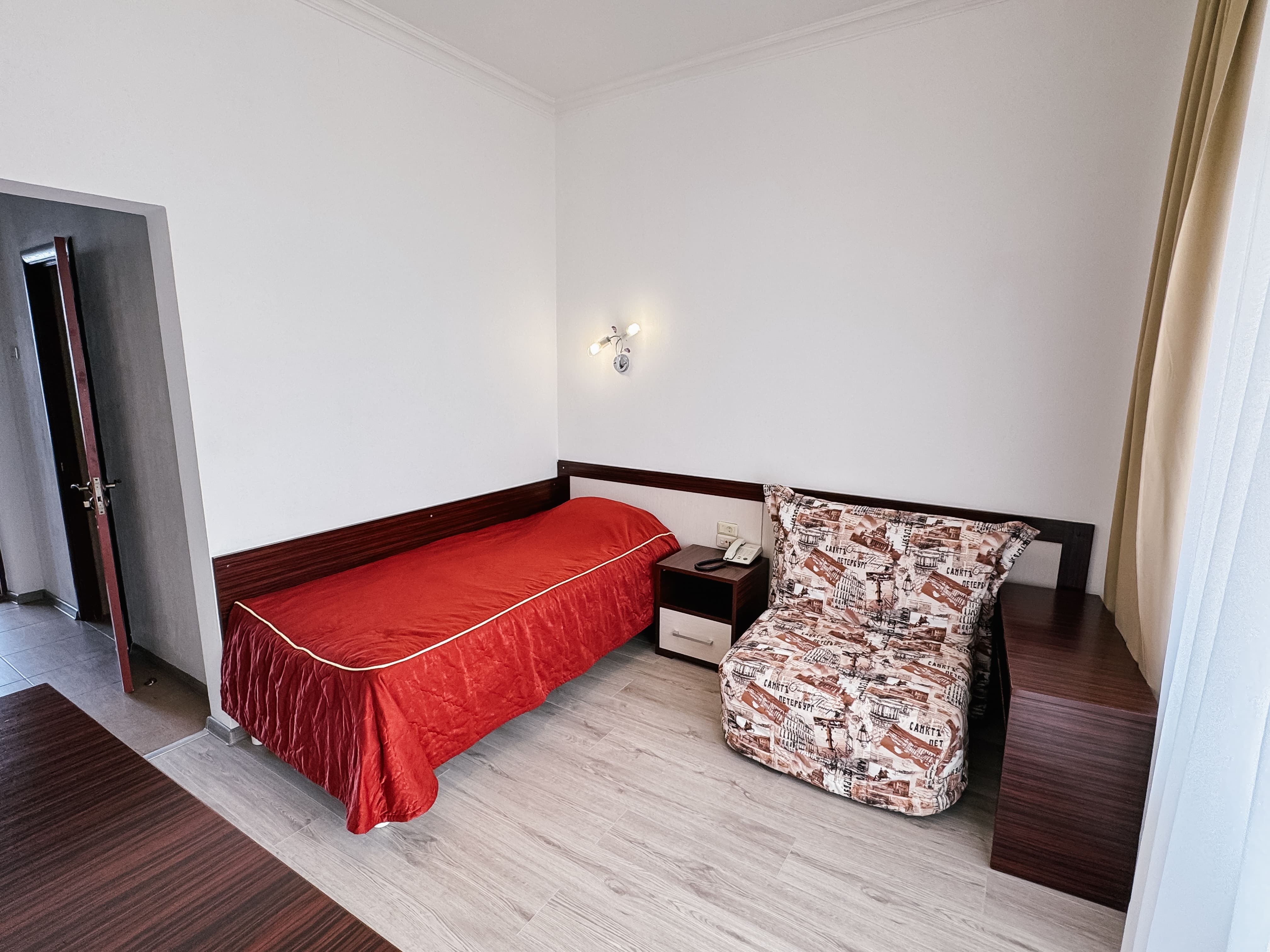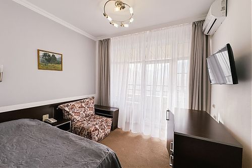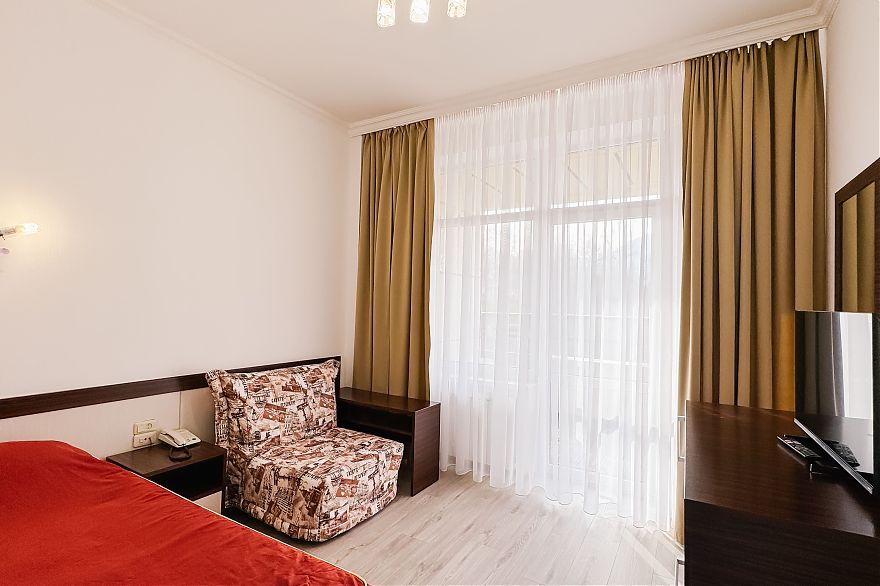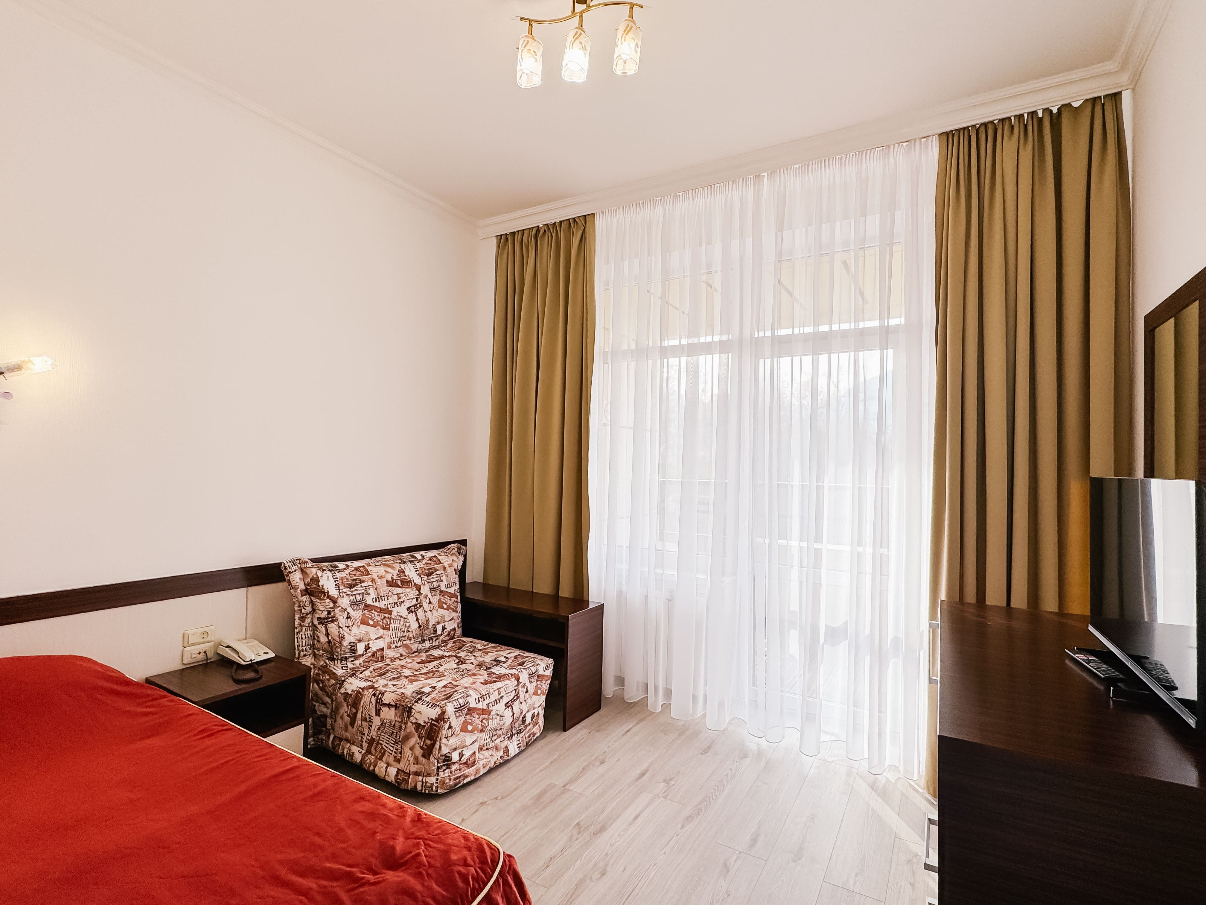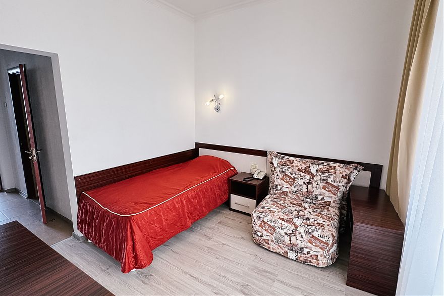 Одноместный номер - номер оборудован всем необходимым для комфортного проживания: удобная мебель, техника, балкон, бесплатный Wi-Fi. Одноместный номер идеально подходит тем, кто ценит личное пространство и предпочитает отдыхать в атмосфере покоя и уюта.
